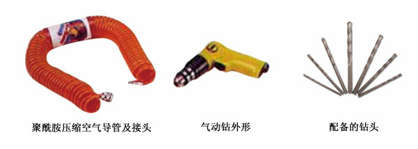 適用于有防火防爆要求的現場作業(yè),具有操作安全、使用方便,鉆孔效率高的特點。氣源為0.5~0.7MPa壓縮空氣,根據現場情況選配適當長度的聚酰胺壓縮空氣導管和相應的快裝接頭。